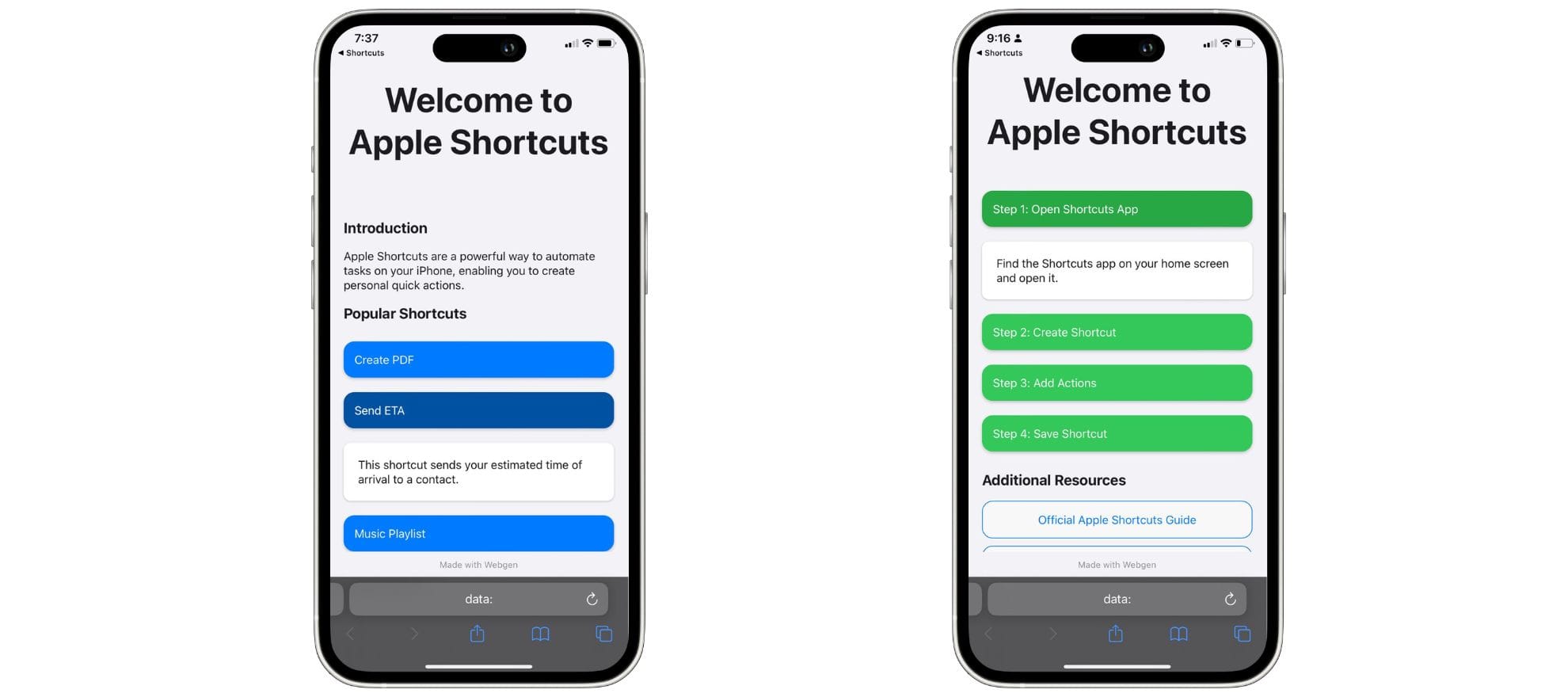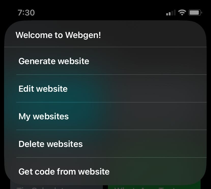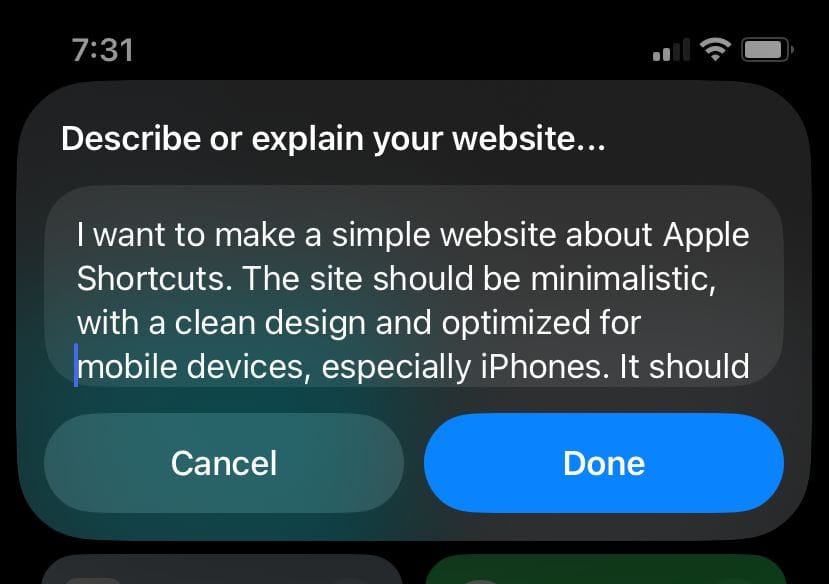 Webgen is a shortcut developed by @Mincofficial that allows anyone to create websites by simply describing what they want in plain English. Once you provide a description, Webgen uses ChatGPT to generate a working website based on your input.