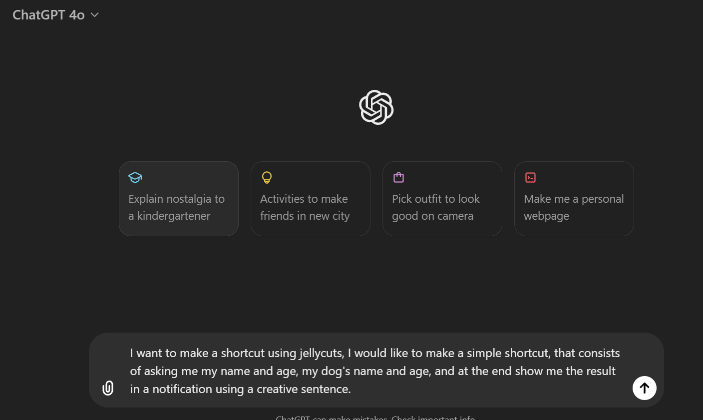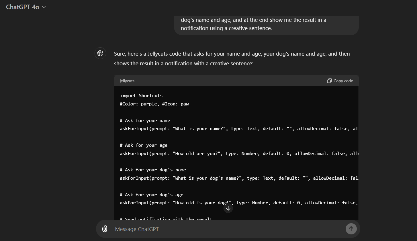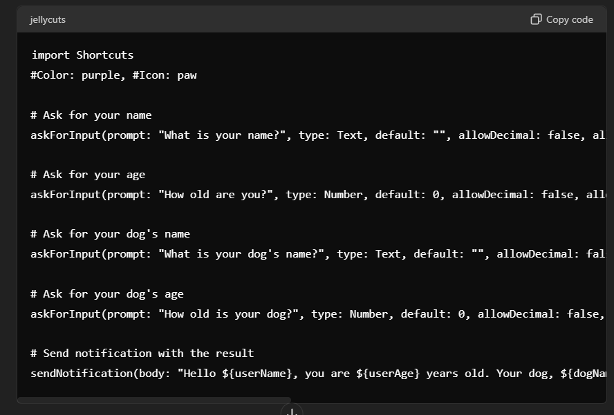I had my doubts at first. I hadn’t yet found an effective way to create shortcuts using Chat GPT, as the conventional method of using blocks in Apple Shortcuts can be quite cumbersome. Remembering that with Jellycuts, I could literally just copy and paste, I decided to try creating a shortcut entirely generated by Chat GPT. For this example, I'll admit I'm not that creative, so I used a straightforward scenario.