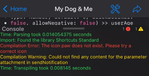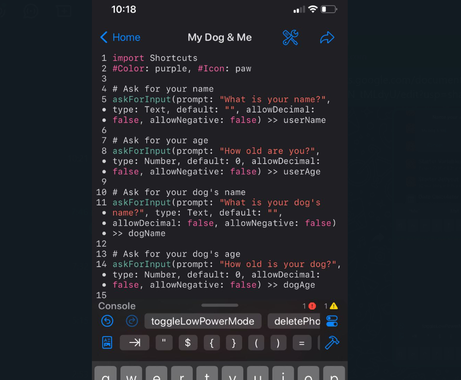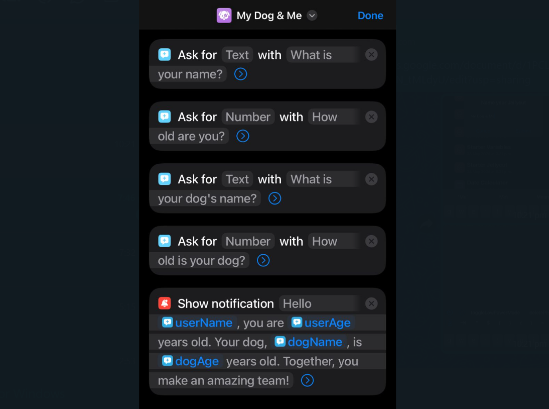 After exporting, I tested the shortcut in the Apple Shortcuts app. It worked perfectly! The shortcut asked for my name and age, my dog's name and age, and then displayed a creative notification with the combined information.