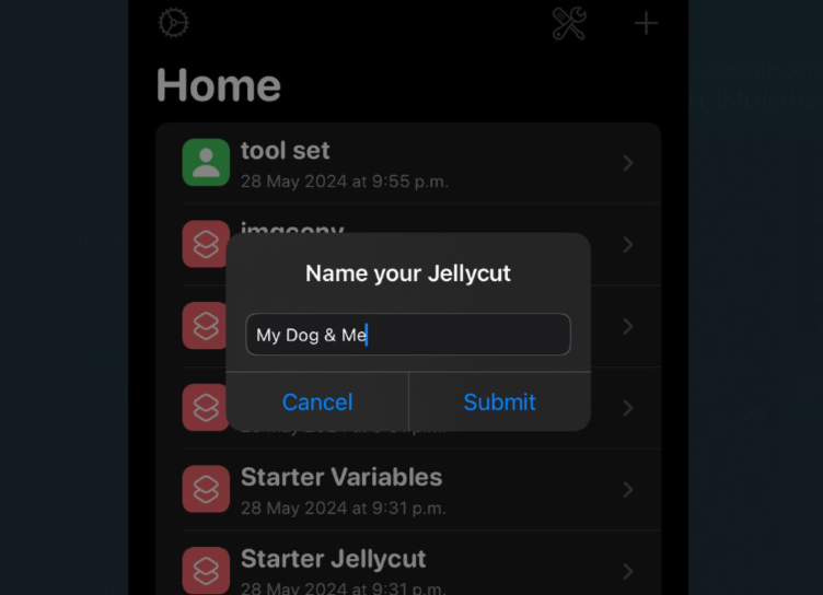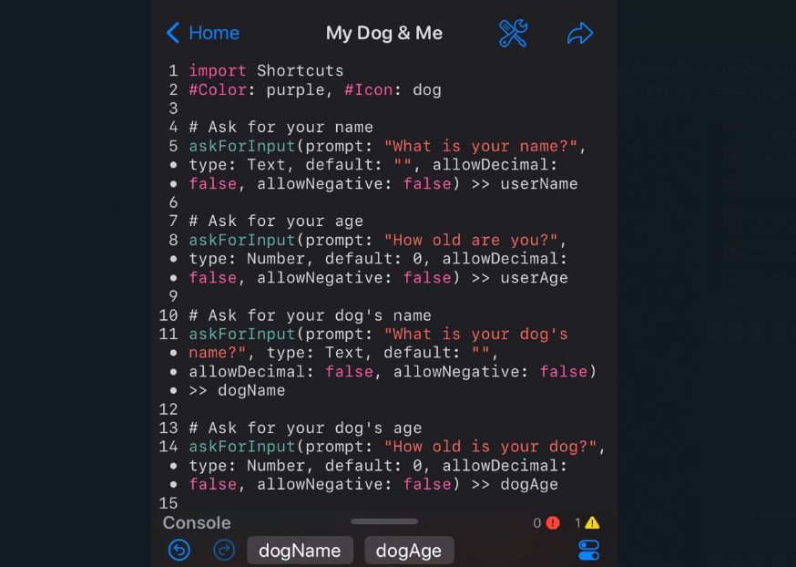 Next, I created a new project in Jellycuts and named it "My Dog & Me." Jellycuts is a powerful IDE for developing Apple Shortcuts, and it provides a convenient environment for writing and managing your shortcut code.