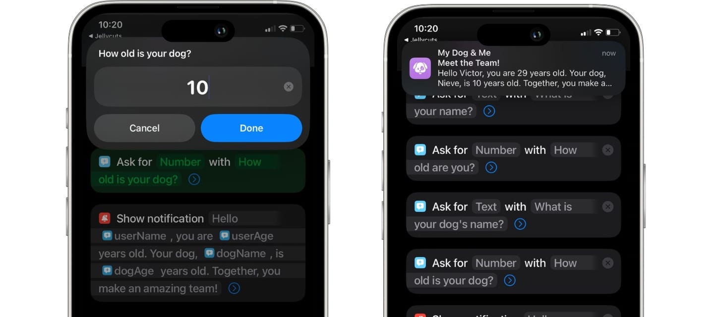 "I want to make a shortcut using Jellycuts. I would like to make a simple shortcut that consists of asking me my name and age, my dog's name and age, and at the end, show me the result in a notification using a creative sentence."