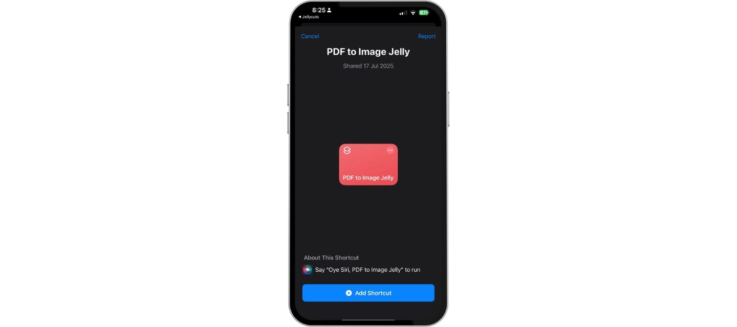 - The Apple Shortcuts app will open, prompting you to add the "PDF to Image Jelly" shortcut. Confirm the addition.