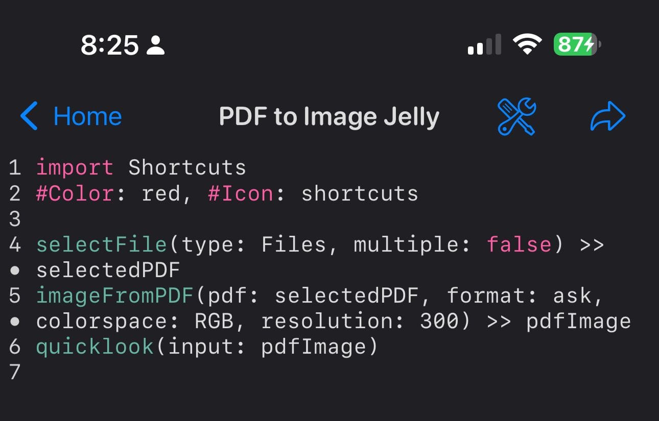 - Open the "PDF to Image Jelly" shortcut in the Shortcuts app.