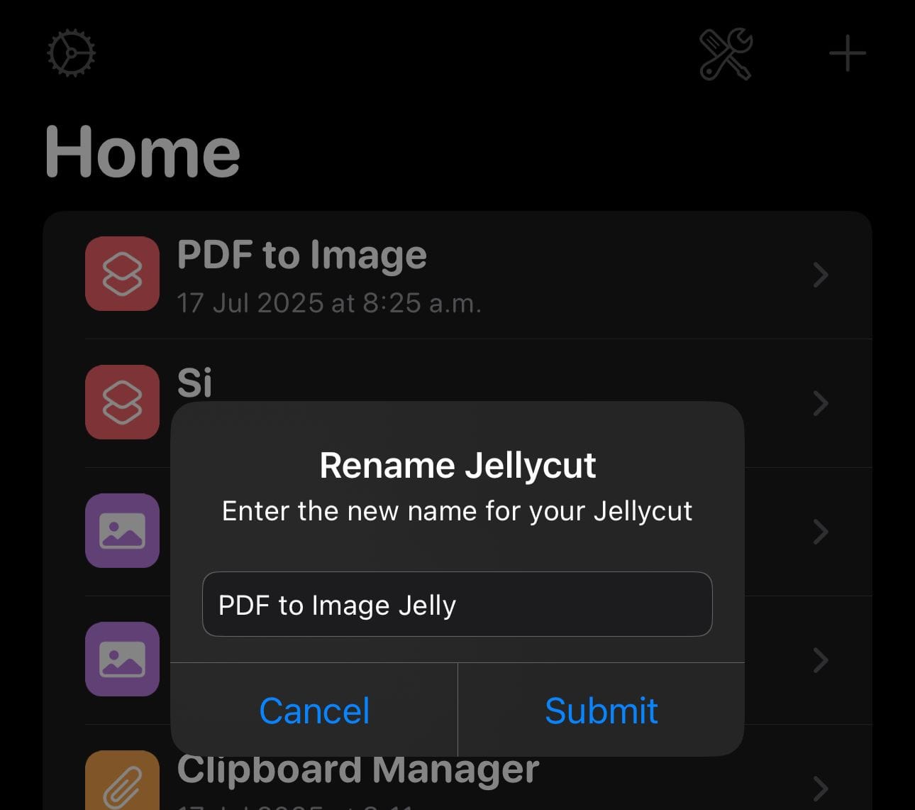Once imported, you'll see the "PDF to Image" shortcut listed in Jellycuts. For this example, we'll rename it: