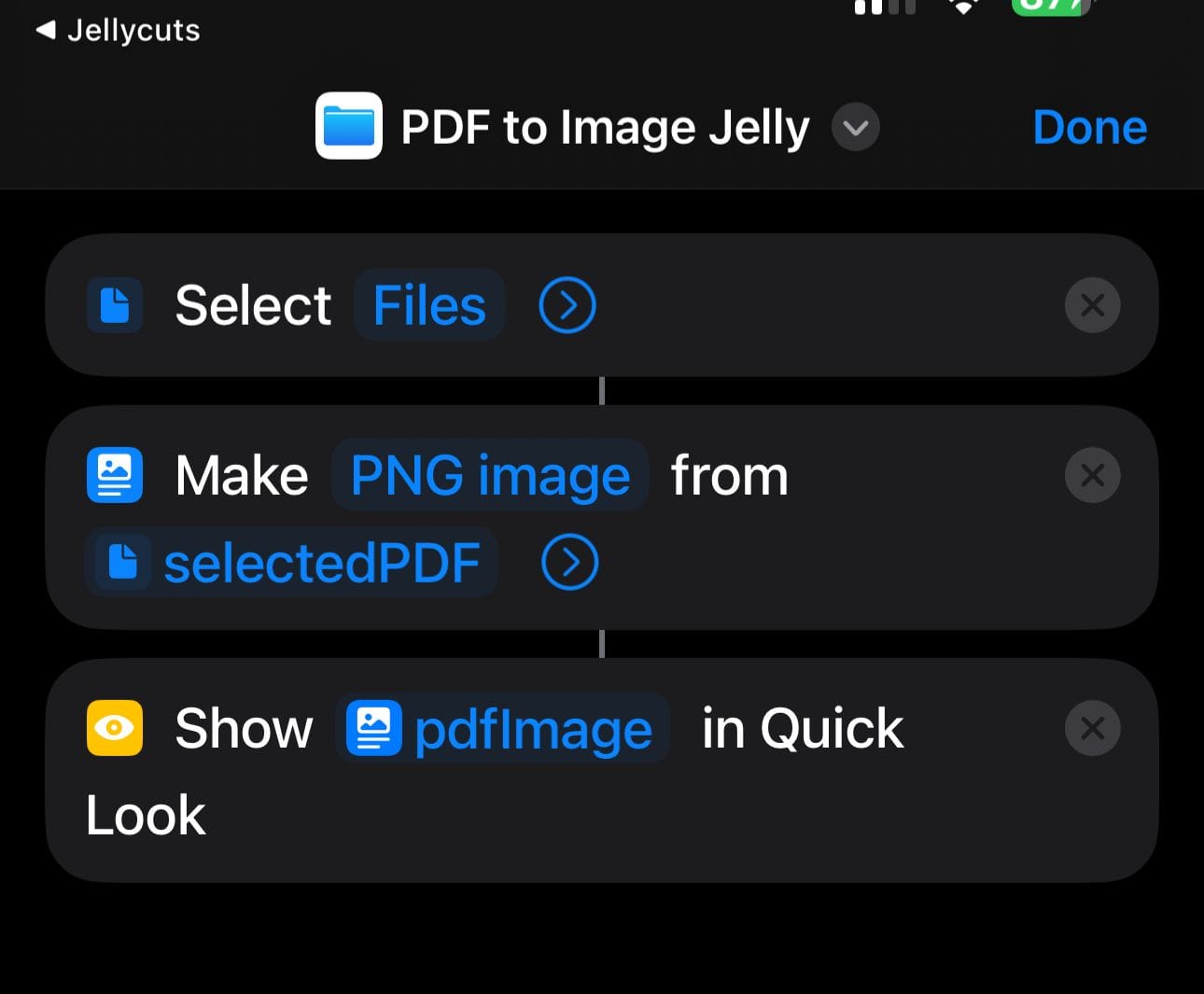 - Compare the actions within this shortcut to those of the original "PDF to Image" shortcut. You should observe that all actions, their configurations, and their order are identical. This demonstrates the accuracy of Jellycuts' import and export capabilities.