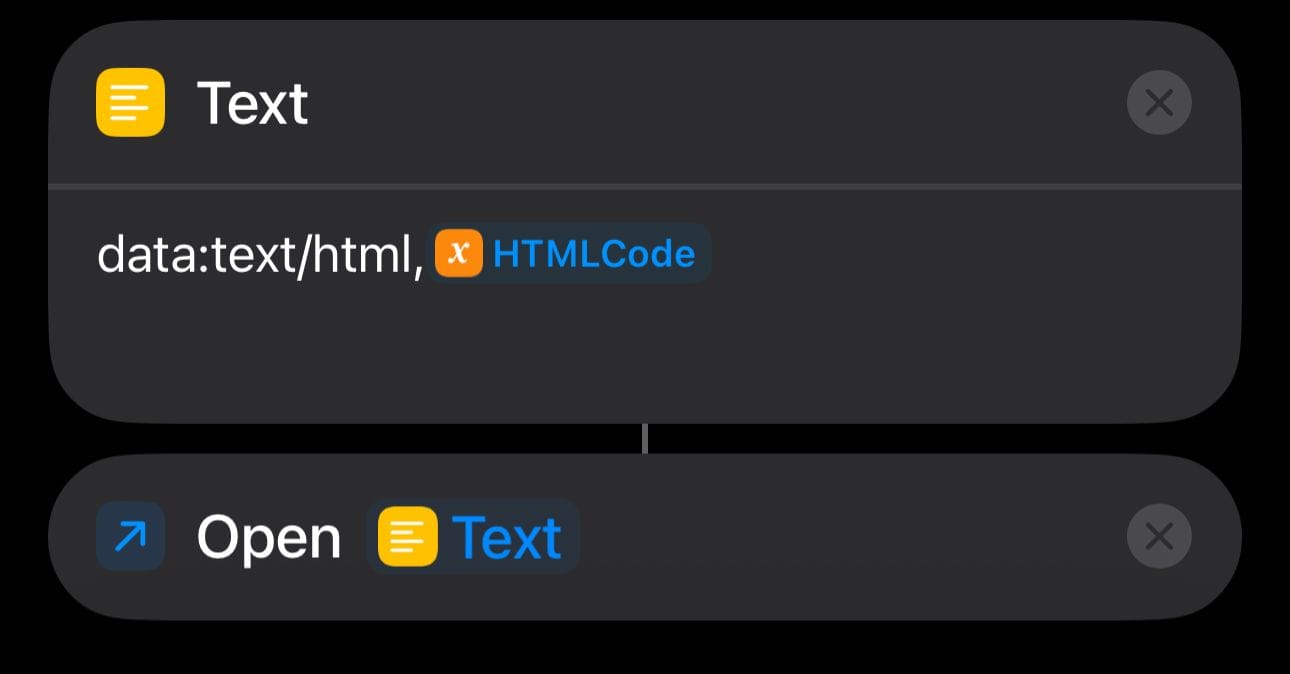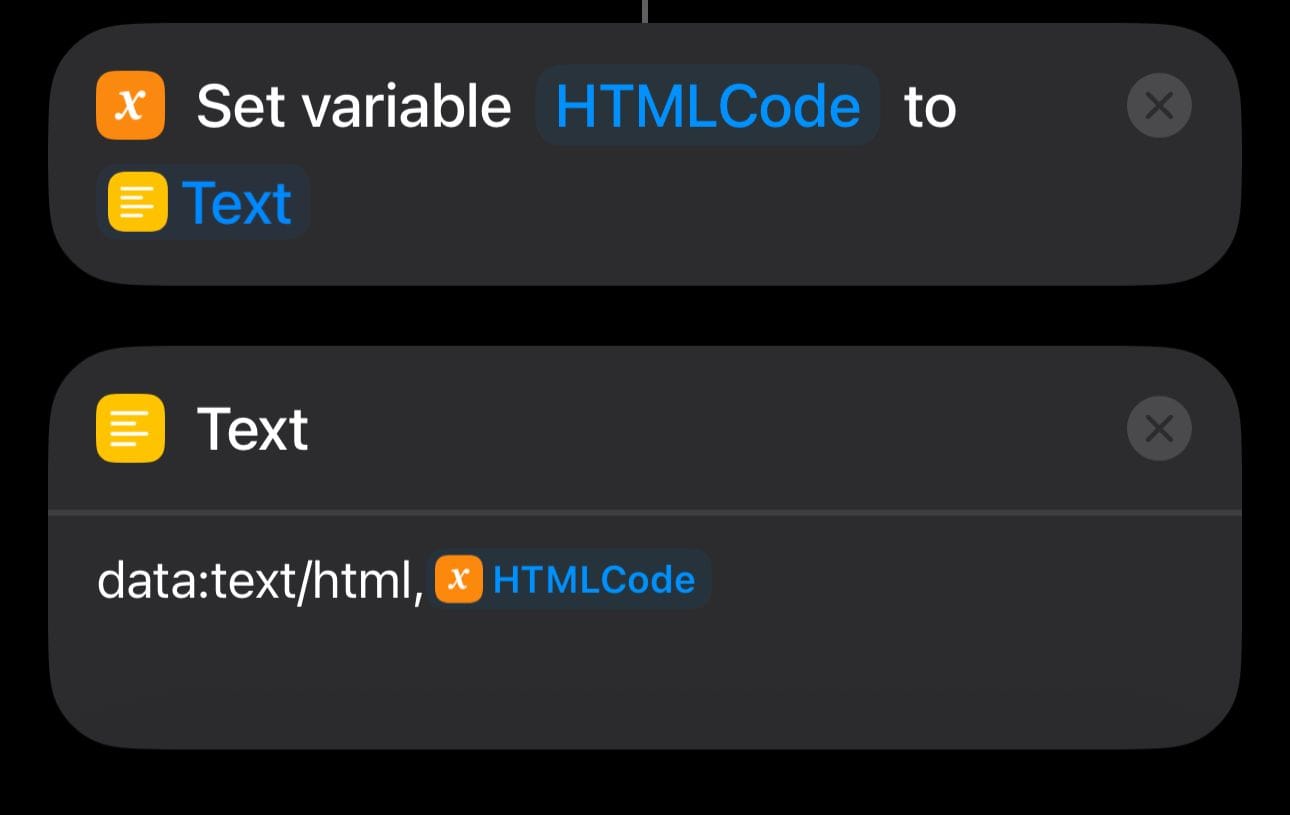 This tutorial shows how to embed HTML + JavaScript into a Shortcut, save it in a variable, and open it directly in Safari (or the Web View). Using the data:text/html scheme, you can run interactive content without hosting it on a server.