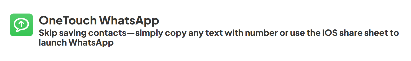 The OneTouch WhatsApp shortcut makes it much easier to send messages to phone numbers not saved in your WhatsApp contacts. This tool is really helpful for those who often need to message new or temporary numbers. With seamless integration with iOS, OneTouch WhatsApp helps you keep your chats quick and hassle-free.