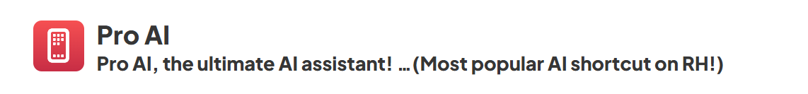 Find Pro AI on RoutineHub, the largest Shortcuts community. With over 8,770 users, it's the most downloaded AI shortcut right now.