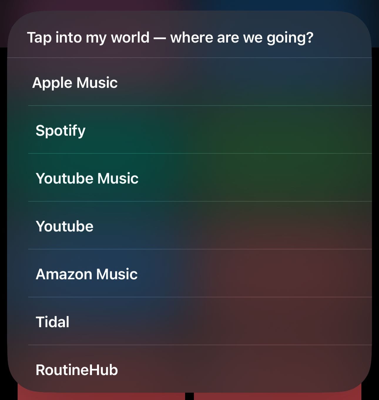menu("Tap into my world — where are we going?",[Apple Music, Spotify, Youtube Music, Youtube, Amazon Music, Tidal, RoutineHub]) {
