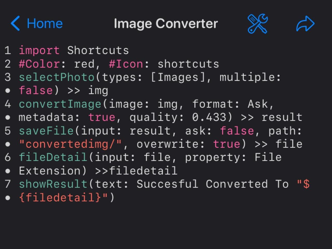 Here, convertImage takes the selected image (img) and converts it to the format chosen by the user (format: Ask). We keep the original metadata (metadata: true) and set a specific quality (quality: 0.433). The converted image is stored in result.